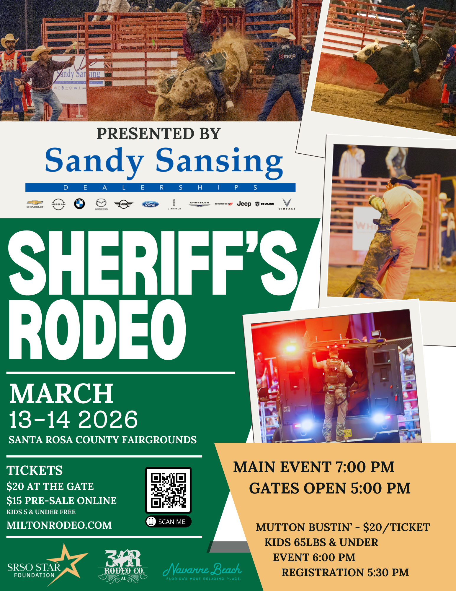 Join us for a family-friendly evening packed with heart-pounding rodeo riding, jaw-dropping K-9 and SWAT demos, and other experiences, all in support of the SRSO Star Foundation. This event directly benefits the brave men and women of the Santa Rosa County Sheriff’s Office, ensuring they have the resources they need to serve and protect our community.